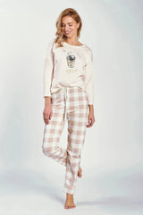 Taro sleeve blouse and long pants Pyjama - Women's pajamas for comfort and style consist of a 3/4 sleeve blouse and long pants. The blouse has a half-circle neckline and a delicate print at the top, adding subtle elegance. The loose, comfortable cut and soft and airy fabric make the pajamas ideal for sleeping. The long pants without pockets, with a drawstring waist and elastic waistband, guarantee a perfect fit and comfortable wear. This combination of comfort and style makes the pajamas a great choice for any night out.